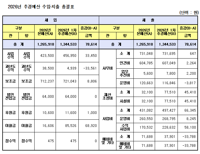「사회복지법인 재무회계규칙 제10조 4항」에 의거하여 재단법인 노원교육복지재단(다모인) 2026년 제1차 추경예산서를 다음과 같이 공고합니다.